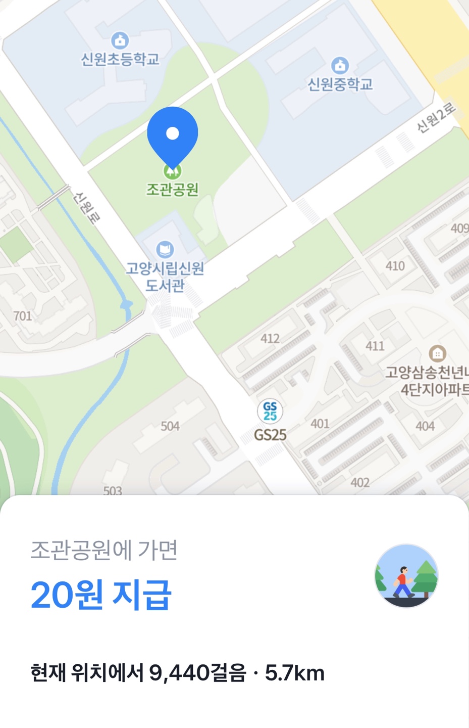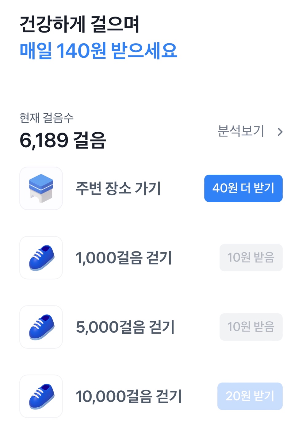 - 다른 만보기 앱과 다른 점이 있다면, 앱 내에서 지정되어 있는 위치 주변에 갔을 때 위치 표시가 나오게 되는데, 해당 표시를 클릭만 해도 20원을 지급받을 수 있습니다. 하루 동안 걸음으로만 적립 가능한 금액은 140원이며, 만보기 앱 중에서는 꽤 괜찮은 금액으로 적립 가능 한 편입니다. (받기 버튼을 눌러야 적립이 가능합니다)